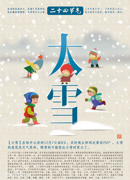 “大雪”是農歷二十四節氣中的第21個節氣,更是冬季的第三個節氣,標志著仲冬時節的正式開始;其時視太陽到達黃經255度。《月令七十二候集解》說:“大雪,十一月節,至此而雪盛也。”大雪的意思是天氣更冷,降雪的可能性比小雪時更大了,并不指降雪量一定很大。