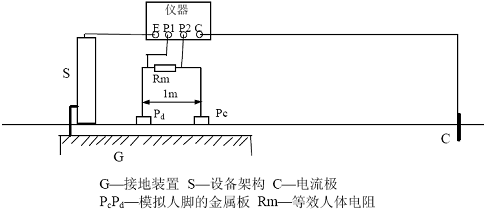 式中Is 為被測(cè)接地裝置內(nèi)系統(tǒng)單相接地故障電流。上述測(cè)量中,若儀器電壓輸入端不并聯(lián)等效人體電阻Rm,則所得結(jié)果為跨步電位差。
