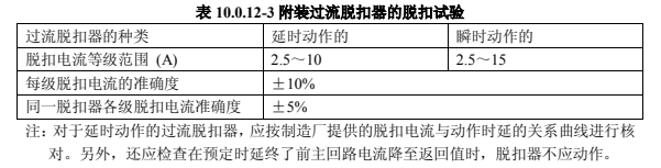 3)附裝過流脫扣器的,其額定電流規定不小于 2.5A,脫扣電流的等級范圍及其準確度,應符合表 10.0.12-3 的規定。