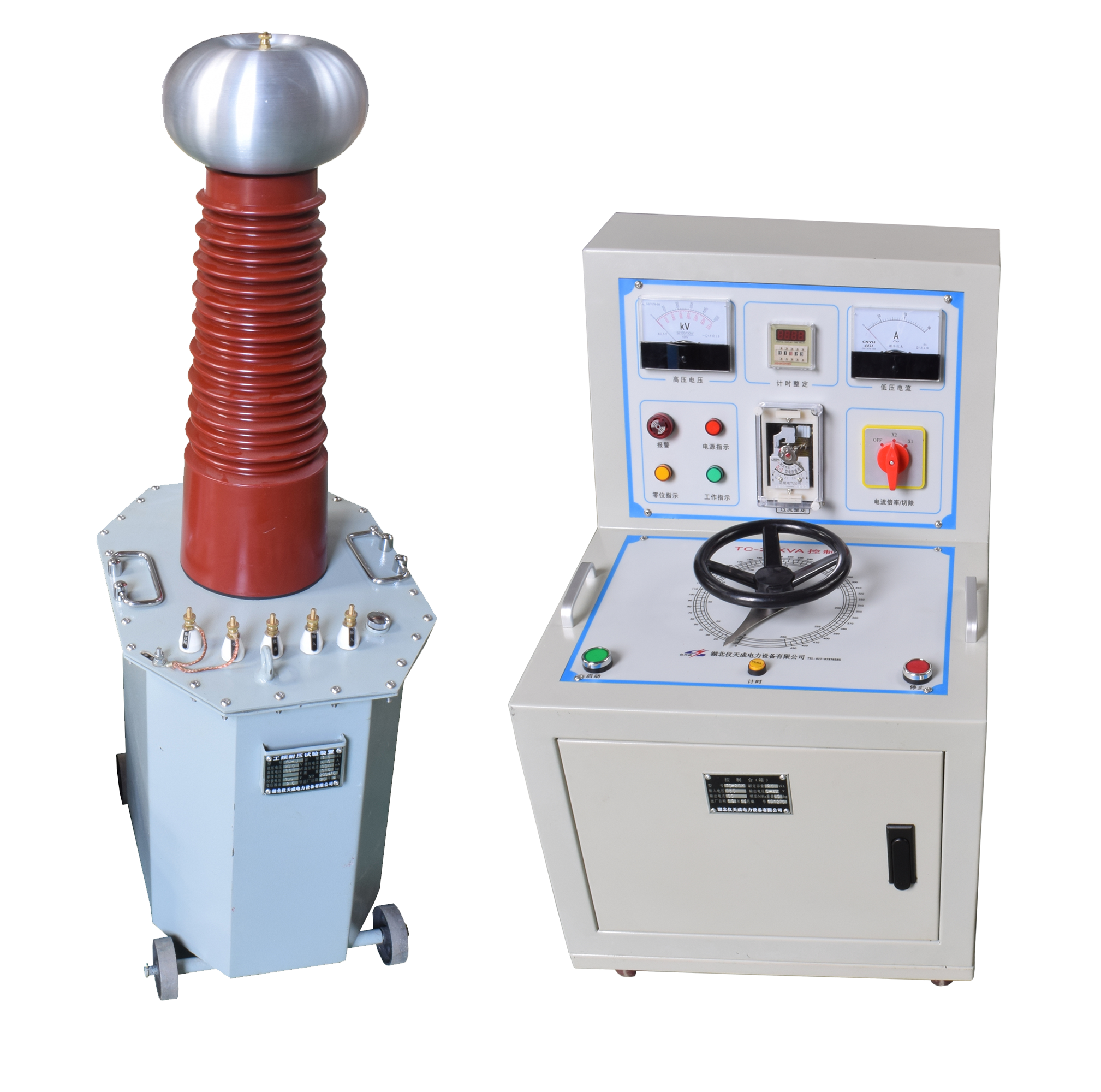 1.油浸式工頻試驗變壓器:核心部件為油浸絕緣的變壓器,絕緣性能穩定、容量大,適用于高壓設備(如電力變壓器、GIS)的現場或實驗室試驗,是傳統主流設備。
