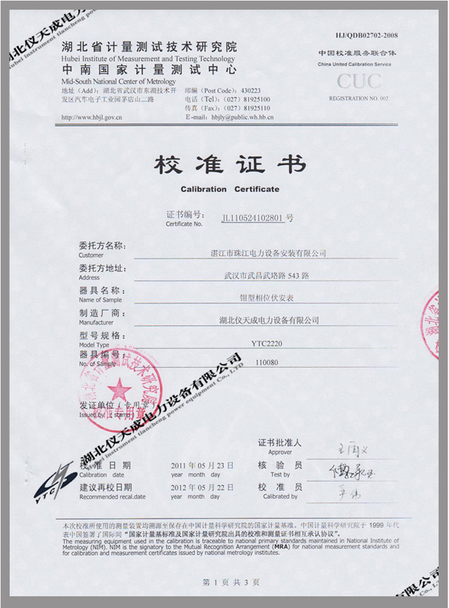 轉載:"YTC2220數(shù)字雙鉗相位伏安表鑒定證書" 請注明來源于儀天成電力。 更多技術問題請致電儀天成電力客戶服務:027-87876585,技術部專線:027-87876585,在線客服:719388481